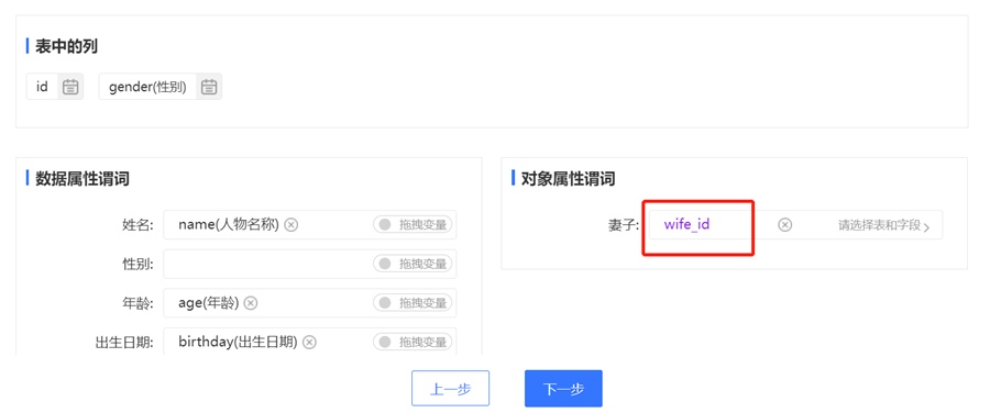 完成对应关系处理后,点击右上角“保存当前表”,则下拉框中的表会显示成"已处理",所有表处理完之后就可以点击“下一步”按钮进行后续处理, 若拖拽入对象属性谓词框中的元素没有点击右键进行映射,元素会呈现紫色,无法点击“下一步”按钮。