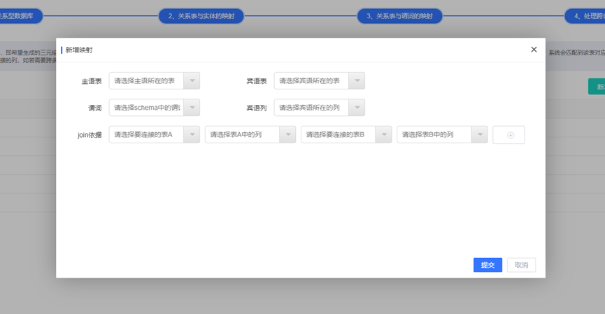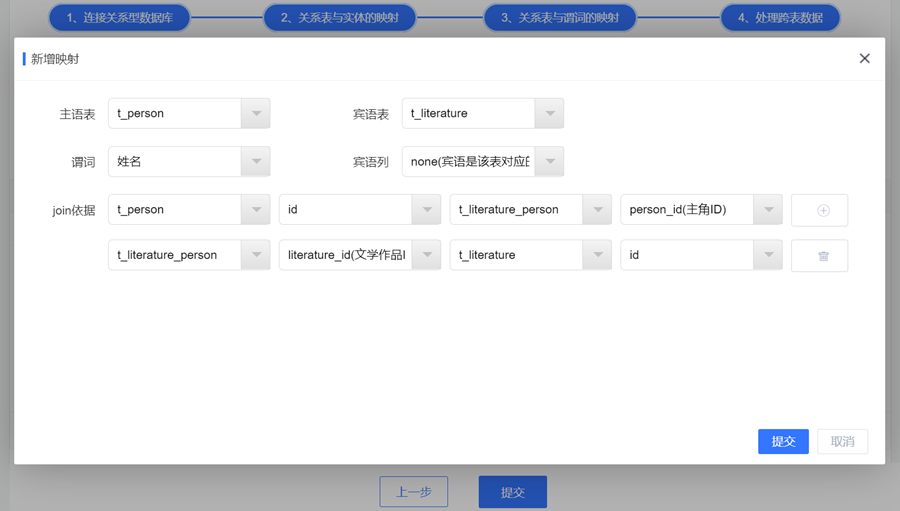 存在希望生成的三元组的主语和宾语来自不同的关系表,即需要处理跨表数据。通过依次选择主语所在的表、schema中谓词、宾语所在的表、宾语所在的列,以及跨表连接的依据。
