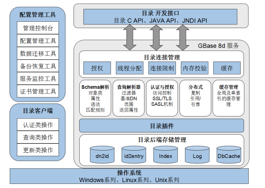 GBase 8d 目录服务系统主要由六个部分组成: