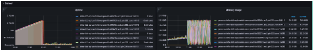 上午 10:00,扩容操作开始,剩余 TiDB 实例的内存使用量持续增长。上午 10:55,内存使用量激增,所有 TiDB 实例由于 OOM 问题不断重启。