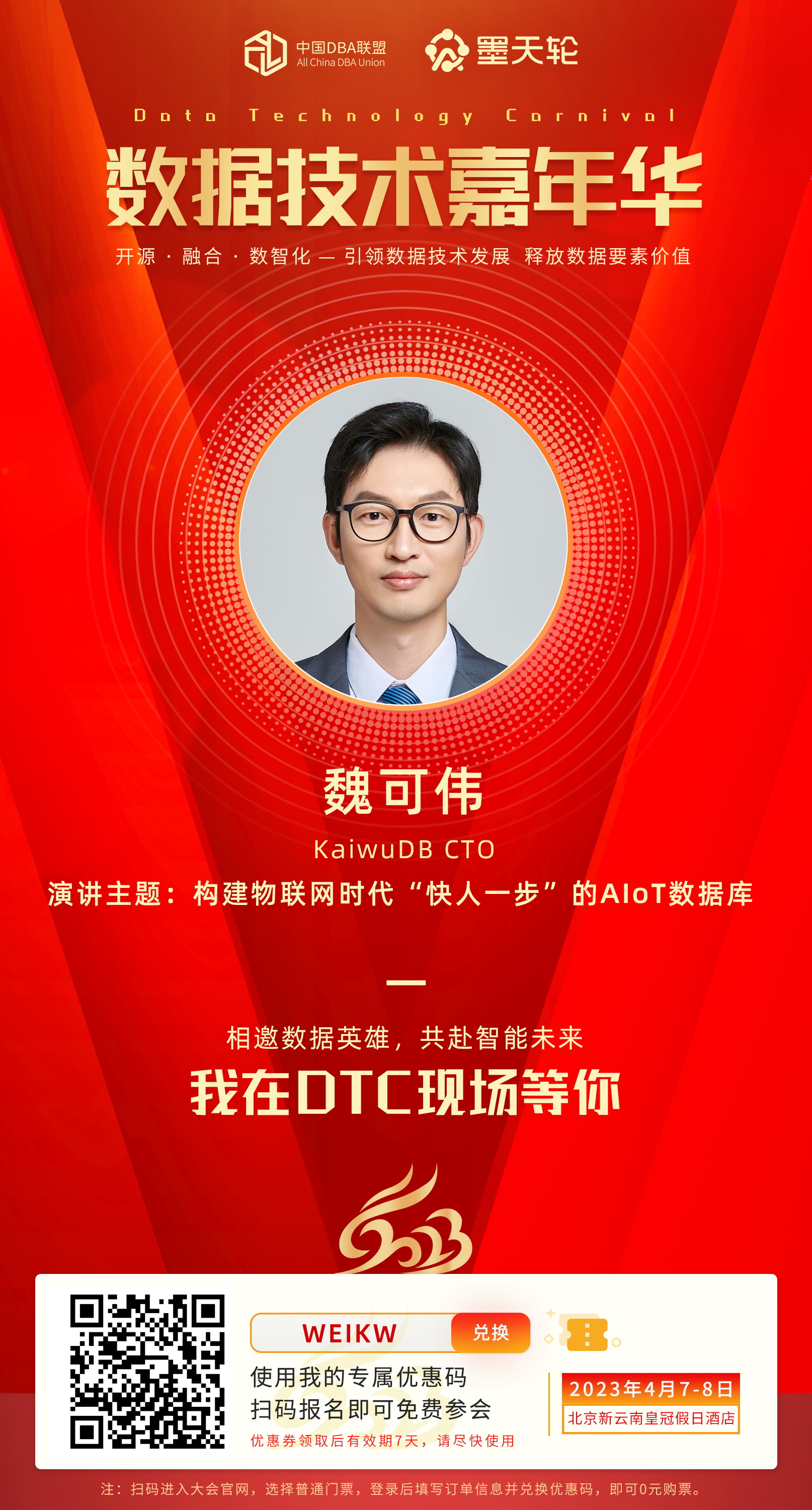4月7日-8日,由中国 DBA 联盟(ACDU)和墨天轮社区联合主办的第十二届『数据技术嘉年华』 将在北京新云南皇冠假日酒店盛大开启。本届大会邀请到 KaiwuDB CTO 魏可伟先生,他将围绕 AIoT 数据库面临的挑战,从 KaiwuDB 1.0 的核心技术、数据库架构、功能及特性分析等内容入手,与大家分享“构建物联网时代 AIoT 数据库”的实践之路。