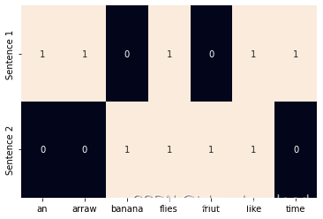 sns.heatmap(one_hot, annot=True, cbar = False, xticklabels = vocab, yticklabels=['Sentence 1','Sentence 2'])