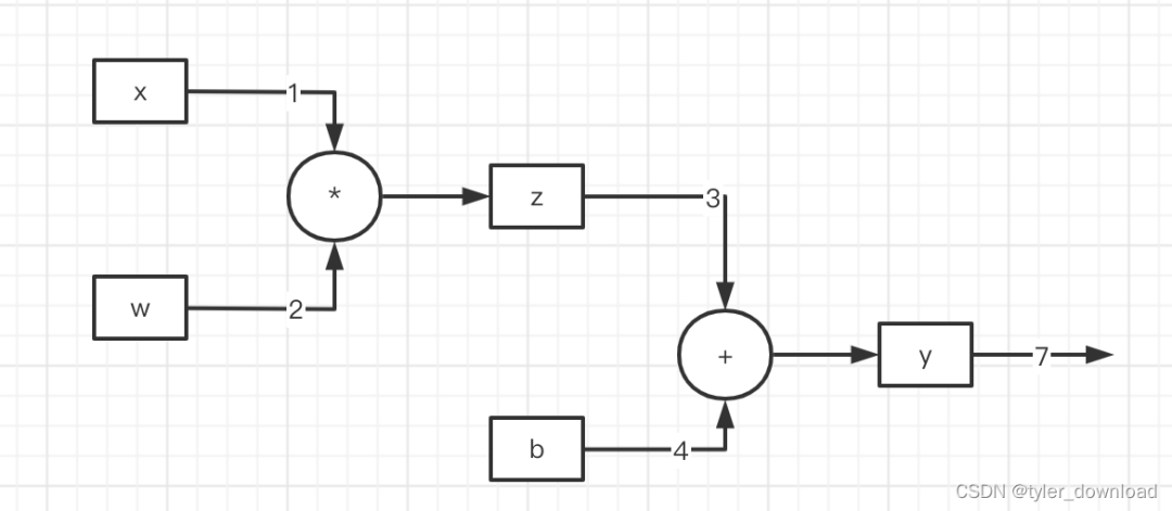 下面我们看运算图的概念。在上图中“模型”其实可以使用传统数据结构中的“图论”来表示。“含有很多个参数的函数”其实可以使用链表来表示,当算法对函数的参数进行求导时,这些运算就可以通过链表来完成,我们看一个具体例子,对于函数y = wx+b,我们可以用链表表示如下: