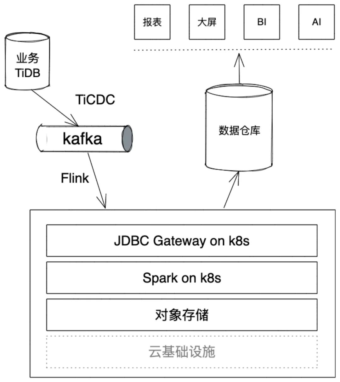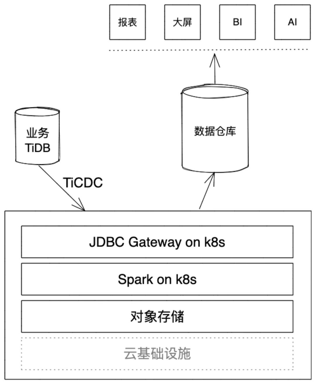 基于以上分析,单纯的使用 TiFlash、TiSpark 并不能完全贴合我们的诉求,基于我们多年的技术积累,我们架构了一套跟 TiDB 打通的数据仓库架构,具有低成本、多云适配的特性,下一节做一些分析,给大家参考。