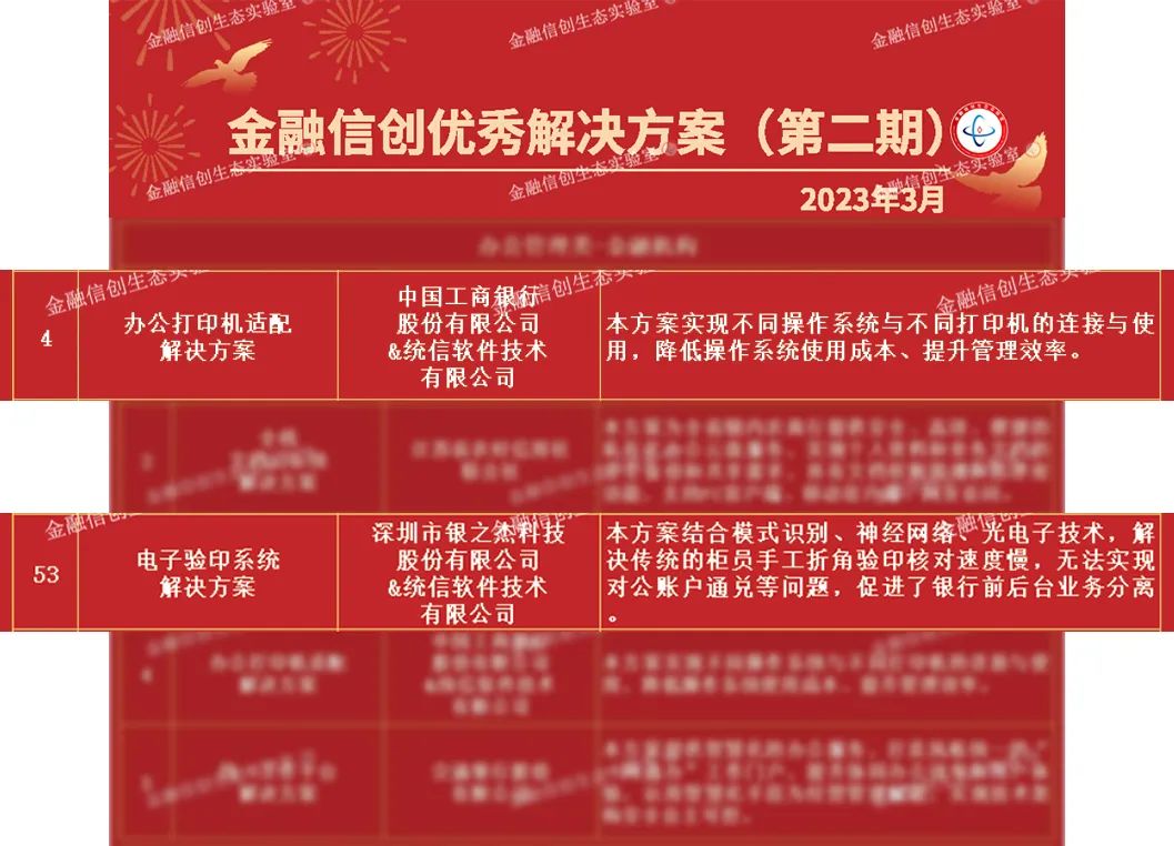 今天,我们与工商银行的“办公打印机适配解决方案”、与银之杰的“电子验印系统解决方案”双双入选金融信创优秀解决方案(第二期)!