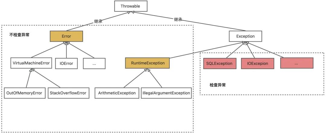 Thorwable类(表示可抛出)是所有异常和错误的超类,两个直接子类为Error和Exception,分别表示错误和异常。 其中异常类Exception又分为运行时异常(RuntimeException)和非运行时异常, 这两种异常有很大的区别,也称之为非检查异常(Unchecked Exception)和检查异常(Checked Exception),其中Error类及其子类也是非检查异常。