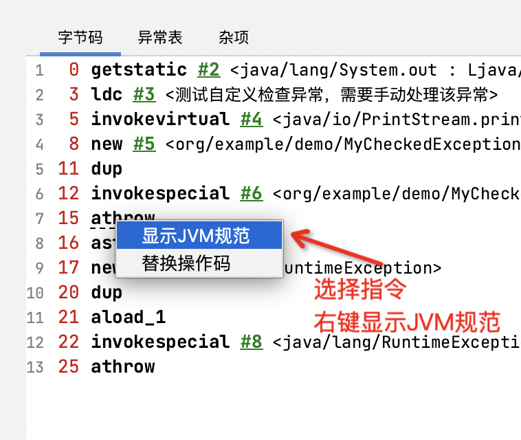 异常表:异常表中用来记录程序计数器的位置和异常类型。如上图所示,表示的意思是:如果在 8 到 16 (不包括16)之间的指令抛出的异常匹配 MyCheckedException 类型的异常,那么程序跳转到16 的位置继续执行。