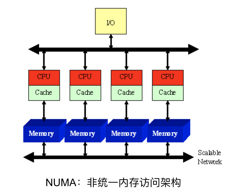 UMA(Uniform Memory Access) 均匀内存访问架构则是与NUMA相反,所以处理器对共享内存的访问距离和时间是相同的。