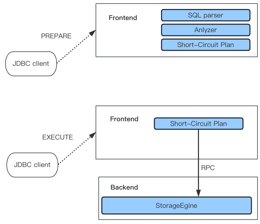 PREPAREMySQL Command 将预编译语句发送给 FE 并由 FE 解析、Analyze 该语句并缓存到上图的 HashMap 中,接着客户端通过