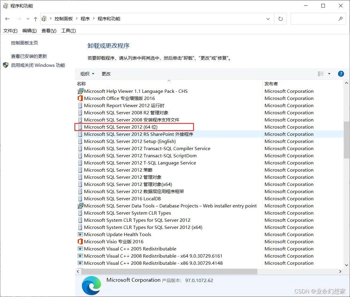 先找到 Microsoft SQL Server 2012(64-bit) 鼠标【右键】-【卸载/更改】(其他版本找到对应的 (64位) 程序,如:SQL Server 2019 就找 Microsoft SQL Server 2019(64-bit))