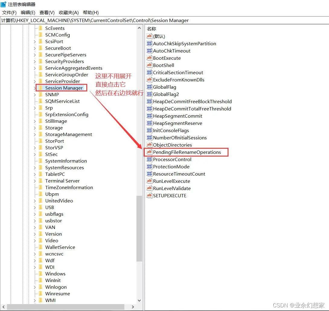 在刚刚展开的列表里面找到 Session Manager ,在右边找到 PendingFileRenameOperations 鼠标【右键】-【删除】