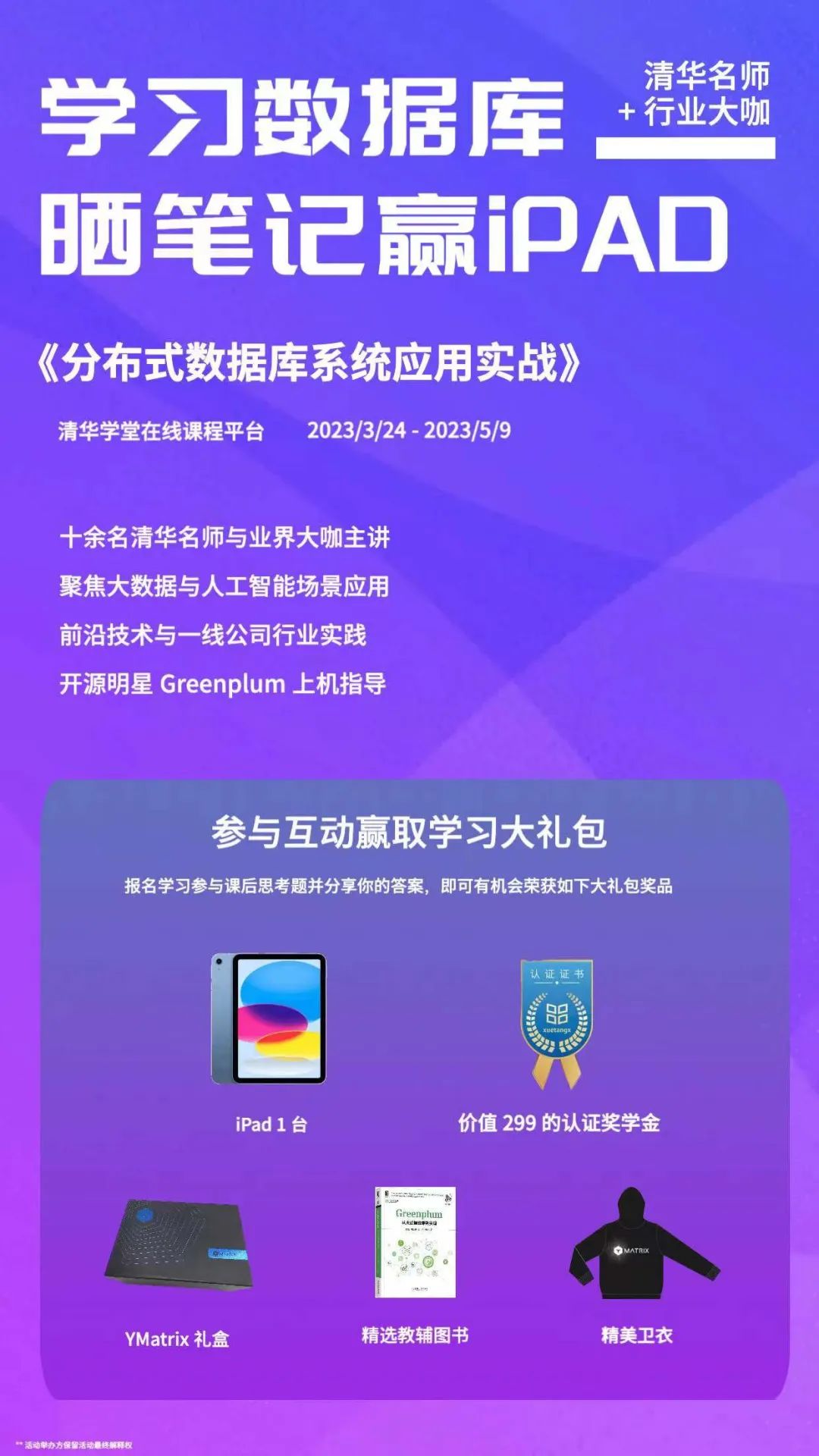 特等奖 1 名:苹果第 10 代 iPad 一台 + 获得价值 299 的课程认证奖学金 + YMatrix 周边礼盒。