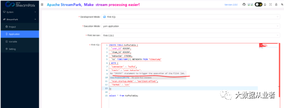CREATE TABLE datagen (f_sequence INT,f_random INT,f_random_str STRING,ts AS localtimestamp,WATERMARK FOR ts AS ts) WITH ('connector' = 'datagen',-- optional options --'rows-per-second'='5','fields.f_sequence.kind'='sequence','fields.f_sequence.start'='1','fields.f_sequence.end'='500','fields.f_random.min'='1','fields.f_random.max'='500','fields.f_random_str.length'='10');CREATE TABLE print_table (f_sequence INT,f_random INT,f_random_str STRING) WITH ('connector' = 'print');INSERT INTO print_table select f_sequence,f_random,f_random_str from datagen;