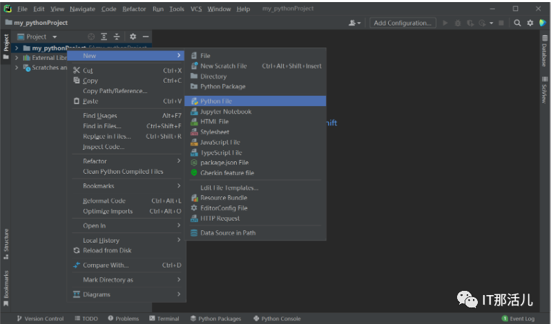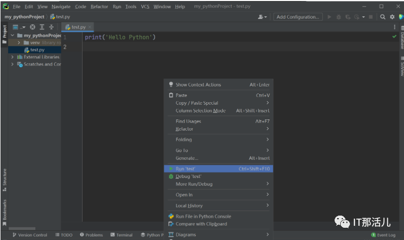 官网:https://www.jetbrains.com/zh-cn/pycharm/download/#section=windows1)找到下载PyCharm的路径,双击点击.exe文件进行安装2)点击Next,进入选择安装路径页面(路径尽量不要带有中文或空格),选择好路径,点击Next进行下一步4)选择开始菜单文件夹,点击install进行安装1)双击桌面上PyCharm图标,勾选,点击Continue2)进入创建项目界面,选择New Project新建项目3)修改Location(项目目录路径),随便命名为my_pythonProject,选择interpreter(解释器):python3.64)创建.py文件,选择项目点击New>Python File,输入文件名test5)运行,写入代码print(‘Hello Python’),右键Run ’test’运行的结果为 Hello Python,说明PyCharm安装好了。同样的File->Settings->Plugins(插件)在搜索栏中输入Chinese(Simplified)下载中文插件并安装重启PyCharm即出现汉化。