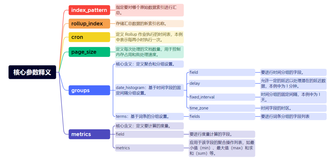 index_pattern:指定要对哪个原始数据索引进行汇总。 rollup_index:存储汇总数据的新索引名称。 cron:定义 Rollup 作业执行的时间表,本例中表示每两小时执行一次。 page_size:定义每次处理的文档数量,用于控制内存占用和批处理速度。 groups:定义聚合和分组设置。 date_histogram:基于时间字段的固定间隔分组设置。 field:要进行时间分组的字段。 fixed_interval:时间分组的固定间隔,本例中为 1 天。 delay:允许一定的延迟以处理潜在的延迟数据,本例中为 1 分钟。 time_zone:时间字段的时区。 terms:基于词条的分组设置。 -fields:要进行词条分组的字段列表。 metrics:定义要计算的度量。 field:要进行度量计算的字段。 metrics:应用于该字段的聚合操作列表,如最小值(min)、最大值(max)和求和(sum)等。