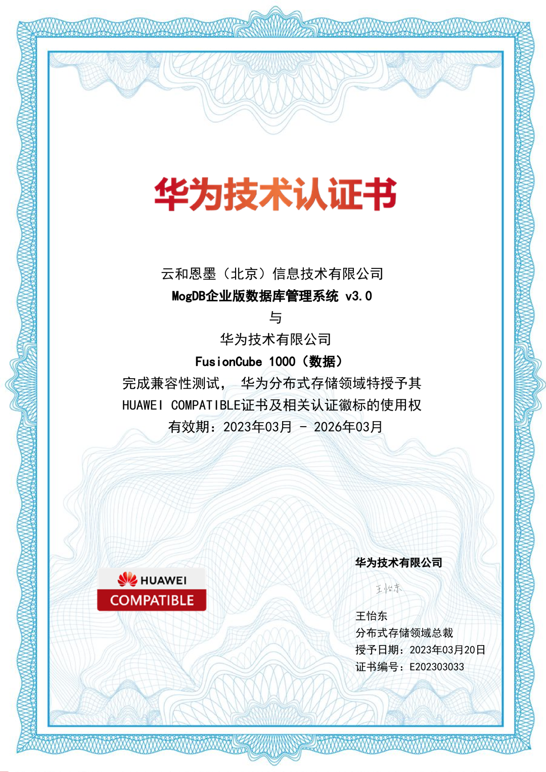 近日,云和恩墨“MogDB企业版数据库管理系统v3.0”与华为“FusionCube 1000(数据)”顺利完成功能和性能测试,并取得华为技术认证证书。