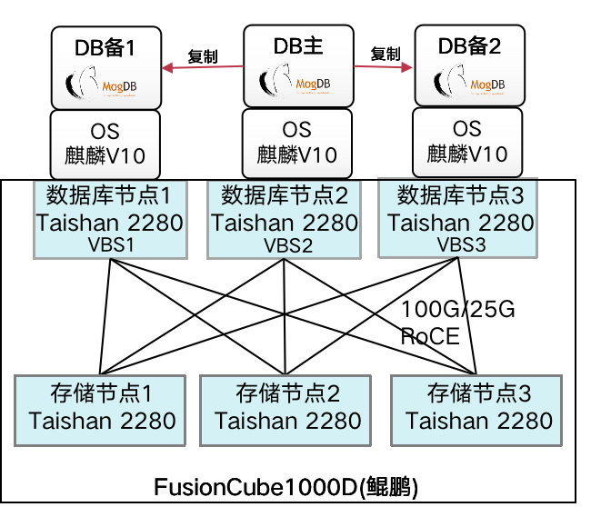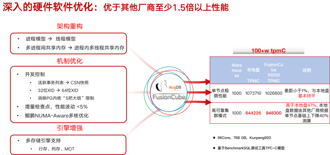 在以 FusionCube 为底座、集成了 MogDB 的华为信创数据库一体机解决方案中,计算节点为三节点,分别部署 MogDB 一主两备,其中1个从节点为异步数据复制,另外1个从节点为同步数据复制。通过架构重构、并发控制和检查点等机制优化,以及多存储引擎的增强,可带来100+w tpmC的卓越性能,高可靠集群模式较本地盘方案能够带来47%的性能提升。