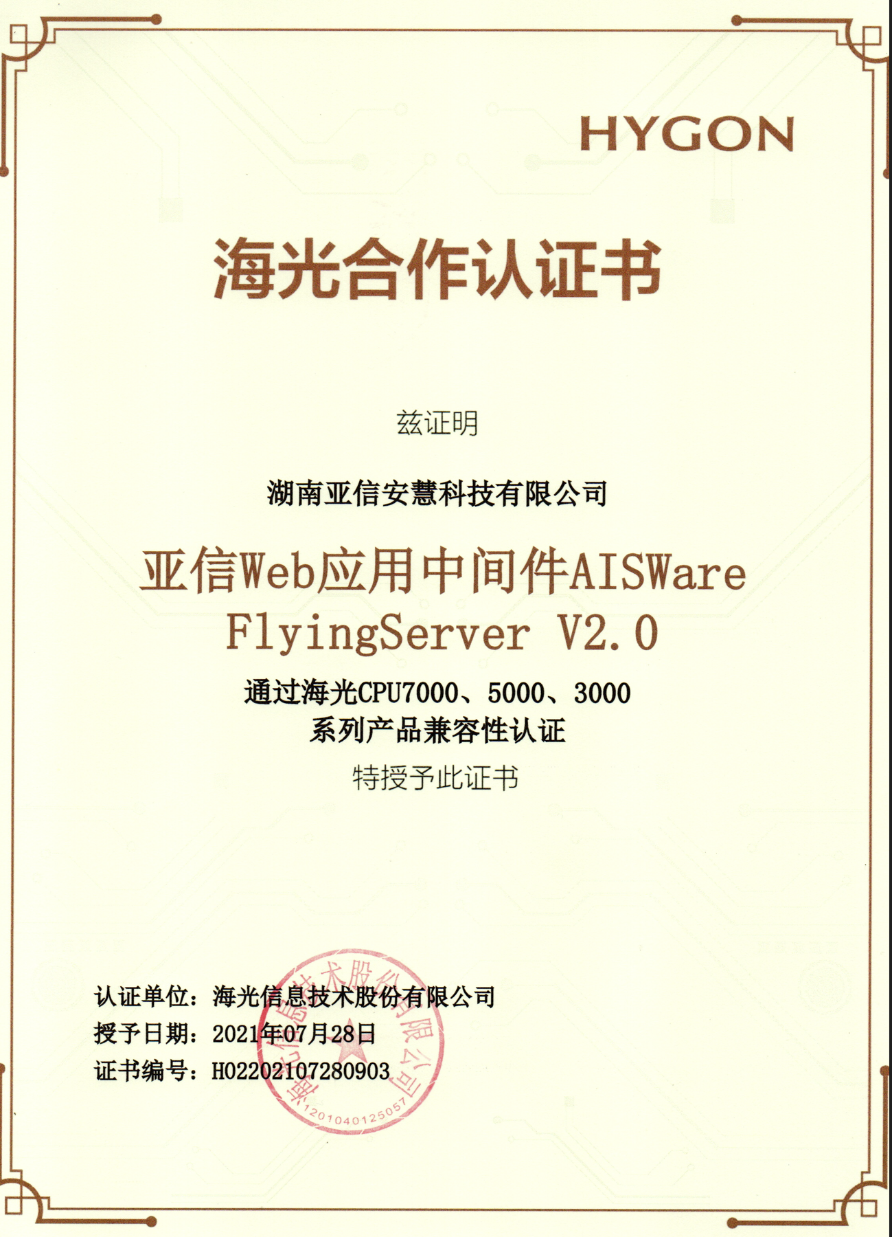 经海光公司与亚信安慧公司的联合测试,亚信WEB应用中间件AISWare FlyingServer V2.0软件与海光3000、5000、7000系列CPU兼容性良好,可以可靠、稳定、高性能地运行。