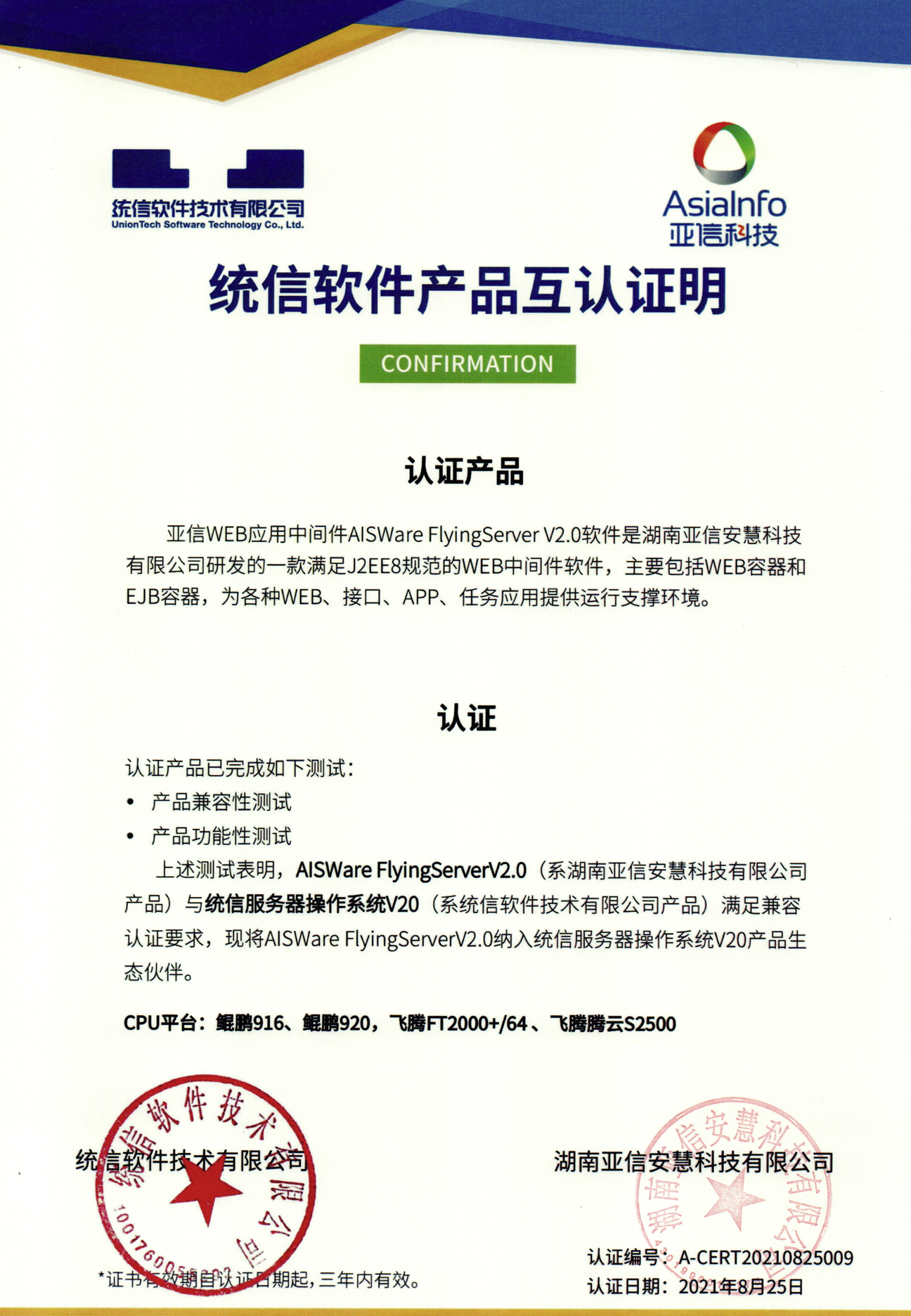 近日,亚信Web中间件(AISWare FlyingServer)产品与统信桌面操作系统V20完成兼容性互认证,并获得“统信软件产品互认证明”证书。。