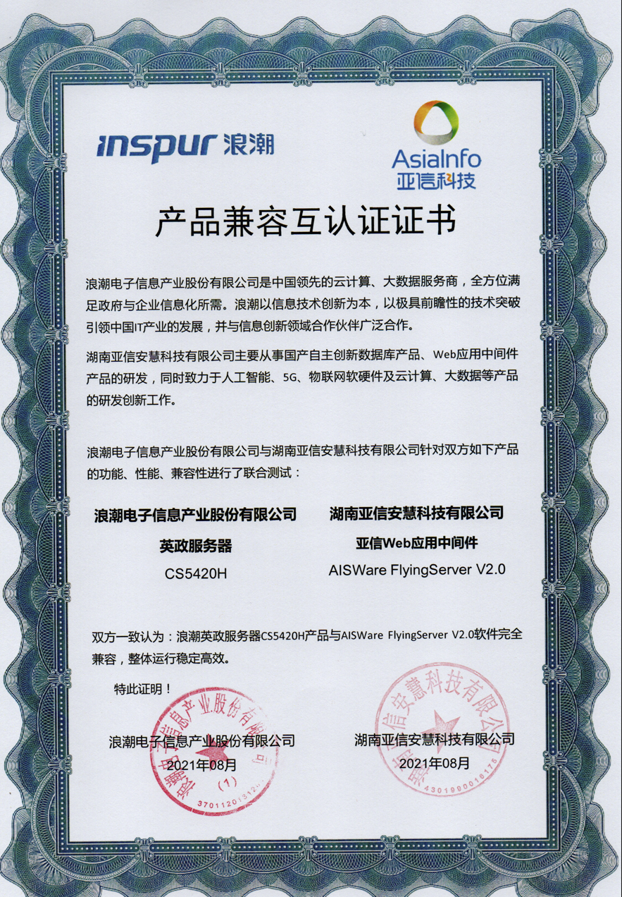 近日,亚信Web中间件(AISWare FlyingServer)产品与浪潮电子信息产业股份有限公司顺利完成兼容性测试。