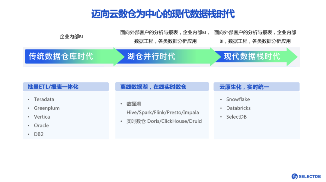 12月30日,SelectDB 携手阿里云共同举办云数仓专场沙龙,在线上沙龙中,来自 SelectDB 和 阿里云的四位云计算领域专家,深入数仓的发展现状和未来趋势,结合企业级的真实场景落地案例,对技术和产品进行了详细的解读。>>> SelectDB Cloud 飞轮科技核心云产品介绍来自 SelectDB 的云产品负责人姜国强总结了目前数据仓库发展的需求与演进方向,他认为:“目前,我们已经来到了以云数仓为中心的现代数据栈时代,数据分析技术的融合发展、云的规模化,可以解决成本问题、实时性问题;云的按需使用、弹性伸缩可以很好的解决传统湖仓并行时代下遗留的问题和挑战,例如运维压力大、资源成本高以及对实时性、效率的更高要求等。”在这样的背景下,飞轮科技诞生,并基于 Apache Doris 研发了新一代云原生实时仓库 SelectDB Cloud。