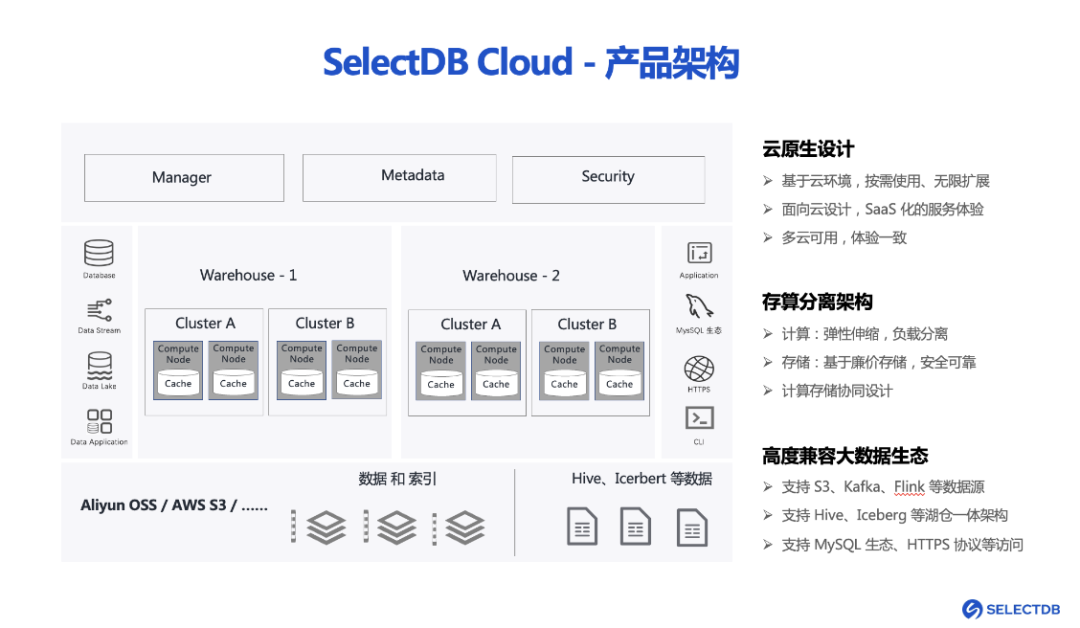 - 面向内部的现代化数据平台:复杂性降低,管理使用成本降低;平台的经济性提升,提供了极高的性价比;多云可用。