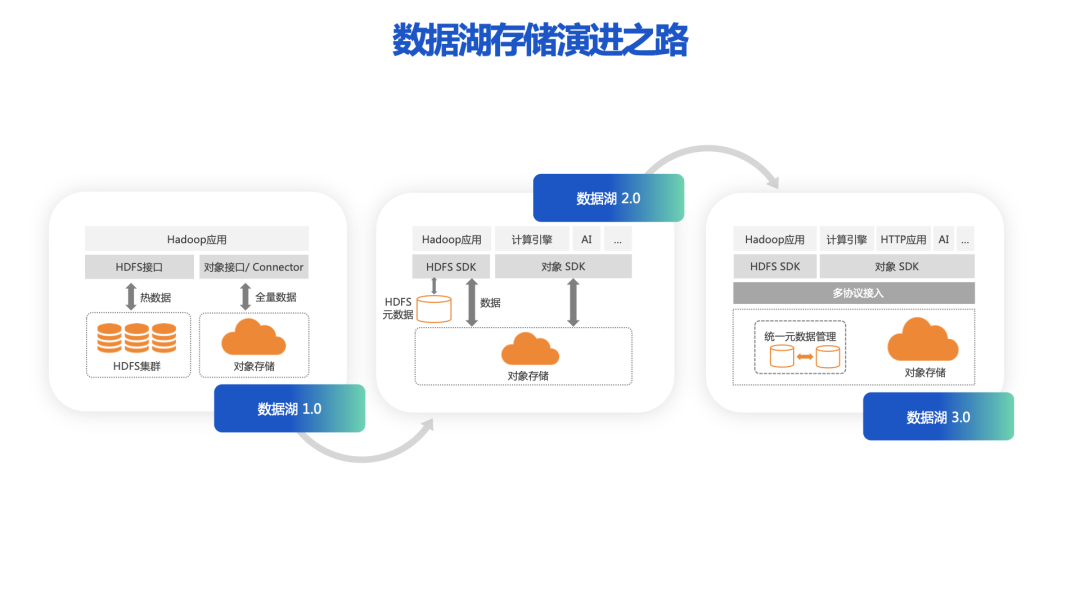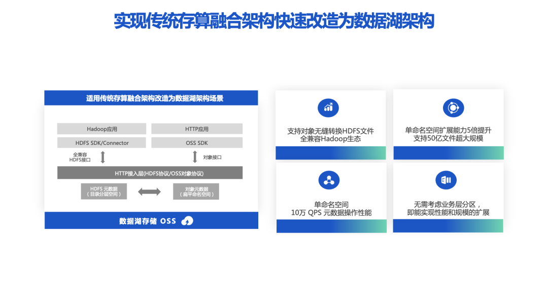 阿里云高级产品专家马骏(其冀)表示,阿里云过去几年支持了上万家客户的云上数据湖和数仓分析业务,在这个过程中,对象存储 OSS 一直紧跟技术发展和客户需求,从数据湖1.0逐渐演进到数据湖3.0,构建了文件对象融会贯通、冷热数据智能分层和云上云下数据互通的能力,进而满足如下几种核心诉求:具体来讲,如下的几大能力,可最大限度的满足云原生数仓或数据湖的构建,让客户无需锁定存储和计算资源,降低架构改造和底层资源的成本实现传统存算融合架构改造成存算分离架构:阿里云 OSS 构建了全面兼容 Hadoop 生态的能力,全兼容 HDFS 的协议接入,基于 Hadoop 的客户无需做改造适配,即可无缝迁移到 OSS 上。同时 OSS 将单个命名空间提升到50亿超大规模文件,10万 QPS 的元数据操作,满足当前乃至未来三到五年的性能需求。这样就可以保持架构的前瞻性,无需担心业务分区和性能扩展问题。OSS 可实现多协议文件的访问,提高小文件处理性能:OSS 同高性能文件存储 CPFS 打通,在面相AI和HPC的场景下,提升小文件的处理性能。客户既能享受对象存储的低成本,同时面向高性能需求可以利用CPFS来承载,提供百TB280万IOPS的性能。该能力可降低95%的计算等待时间,实现POSIX/NFS多协议的支持。实现数据智能分层,成本优化可以达到90%:OSS提供4种类型的存储类型,分别是标准型、低频访问型、归档型和冷归档型,覆盖数据全生命周期,用户可以根据按最后修改时间和最后访问时间制定生命周期策略,冷归档可提供最高分钟级别的取回能力。多层级全场景的数据保护,保证数据不丢不错:作为存储的基础能力,提供了多种可靠性与可用性技术,如版本控制,本地冗余,同城冗余,跨区域复制,全链路校验与纠删码,进而实现99.995%的可用性SLA和12个9的可靠性。阿里云资深技术专家梁明旭(旭一)就全托管的 OSS-HDFS 服务架构做了详细的介绍。该服务是在 OSS 标准存储服务之上建立了一个高可用的元数据服务,其可靠性同 OSS 存储本身相媲美;同时利用Master模块实现了多租户接入;另外由于在 OSS 接入层之下构建,因此可提供服务端的形态,对用户上层应用透明;通过客户端将元数据操作和数据持久化操作进行分离,从而使架构的扩展性得到保障;通过元数据加持能够和 HDFS 等文件系统的层级命名空间相匹配,可以更好的面相客户各种生态兼容。