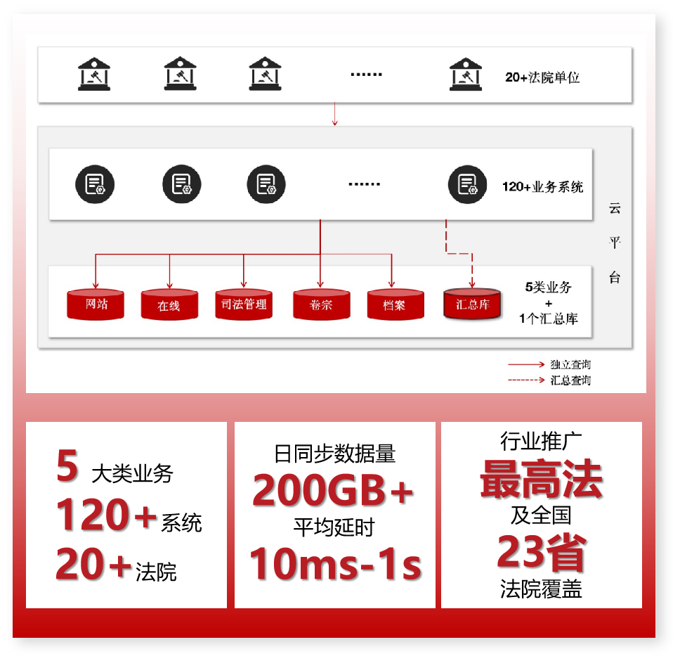云平台中建立统一的5大类业务支撑库,累计支撑数据量4TB+,向上支撑120+系统,为20+法院客户提供统一业务支撑。同时设立汇总库,用于解决原DBLINK方式跨库访问低效问题。