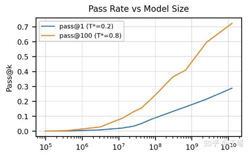 推理时,使用核采样不断采样 Codex 生成的 token,直到碰见以下字符中的任何一个:"\nclass","\ndef","\n#","\nif" , '\nprint'。这样可以大大减小模型第一和最后一层的参数量。实验证明 Codex 可以通过增加模型规模持续精进。如下图所示: