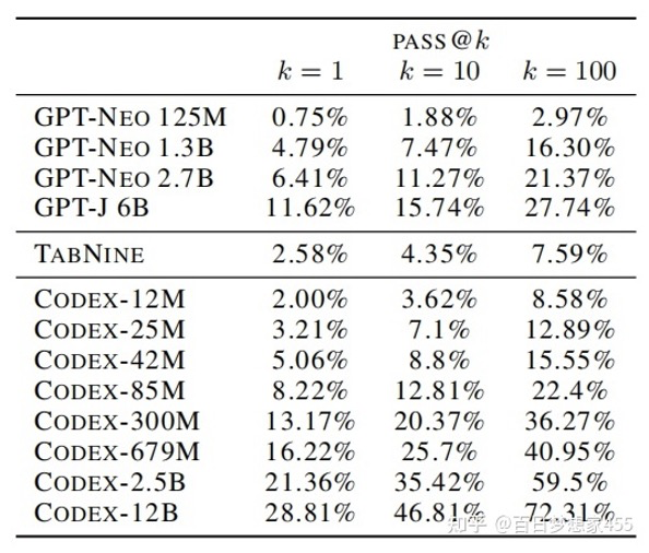 Codex、GPT-Neo、GPT-J 和 TabNine 在 HumanEval 上的实验结果对比如下图所示,可以发现 Codex-300M 的效果优于 GPT-J 6B。