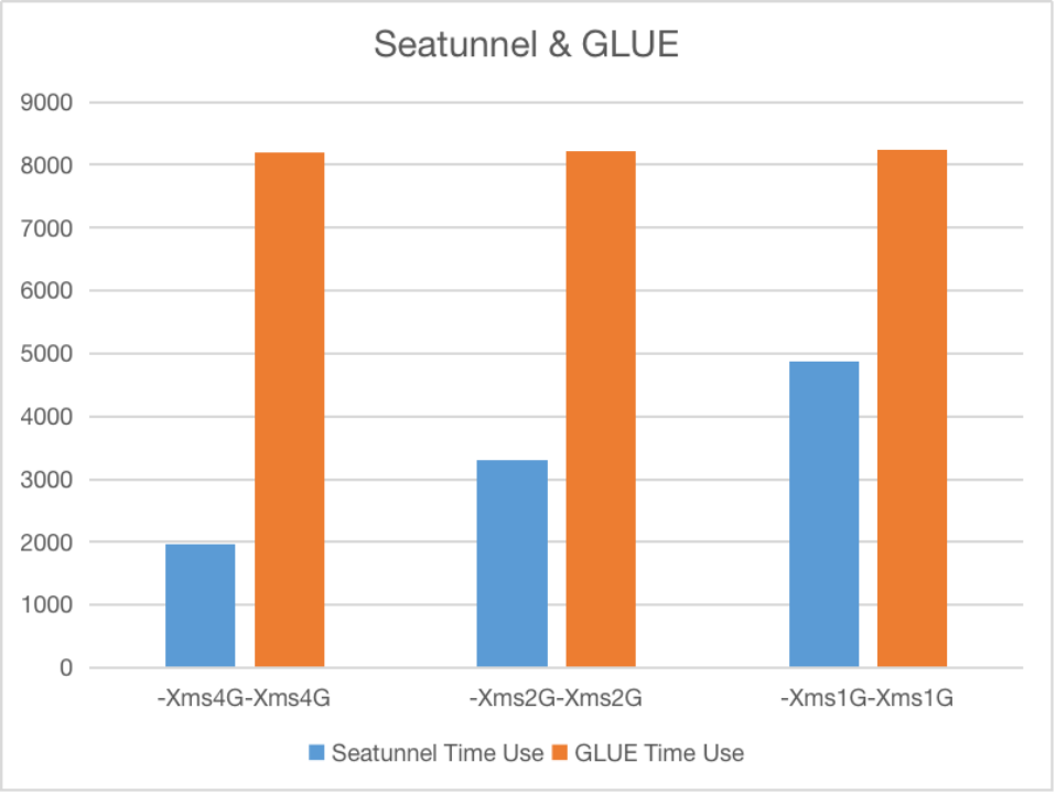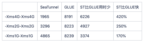 结果显示,SeaTunnel 批量同步 MySQL 数据到 MySQL 比 GLUE 快 420%。