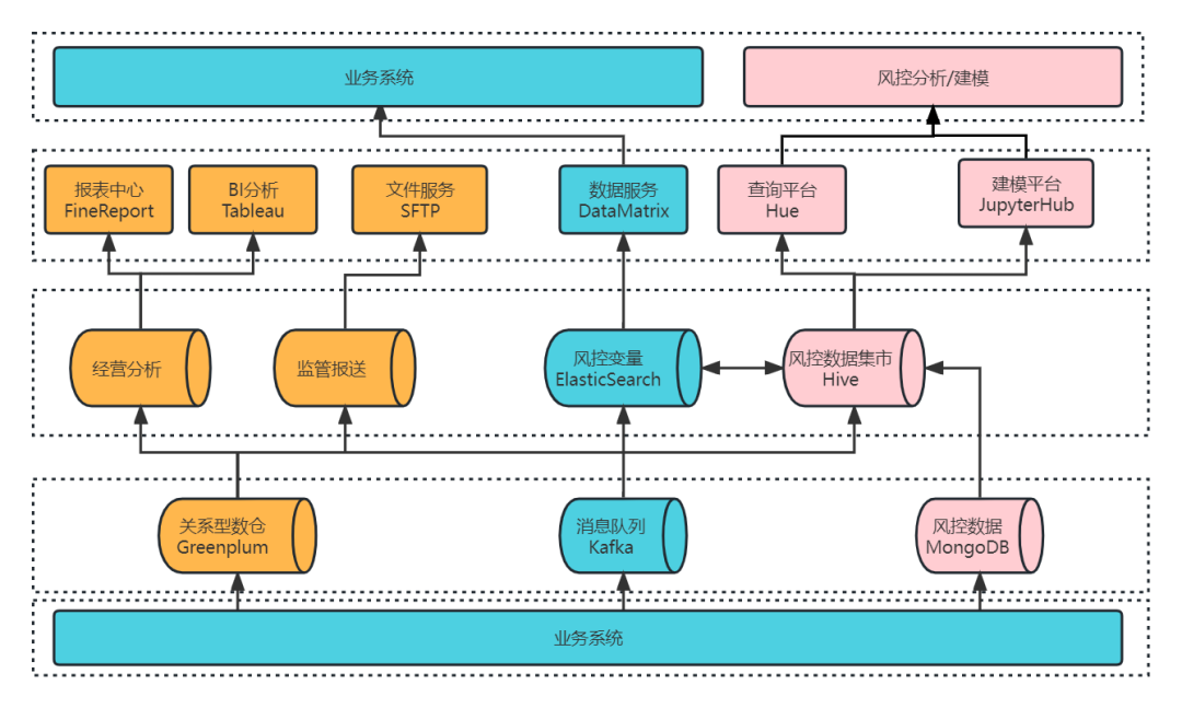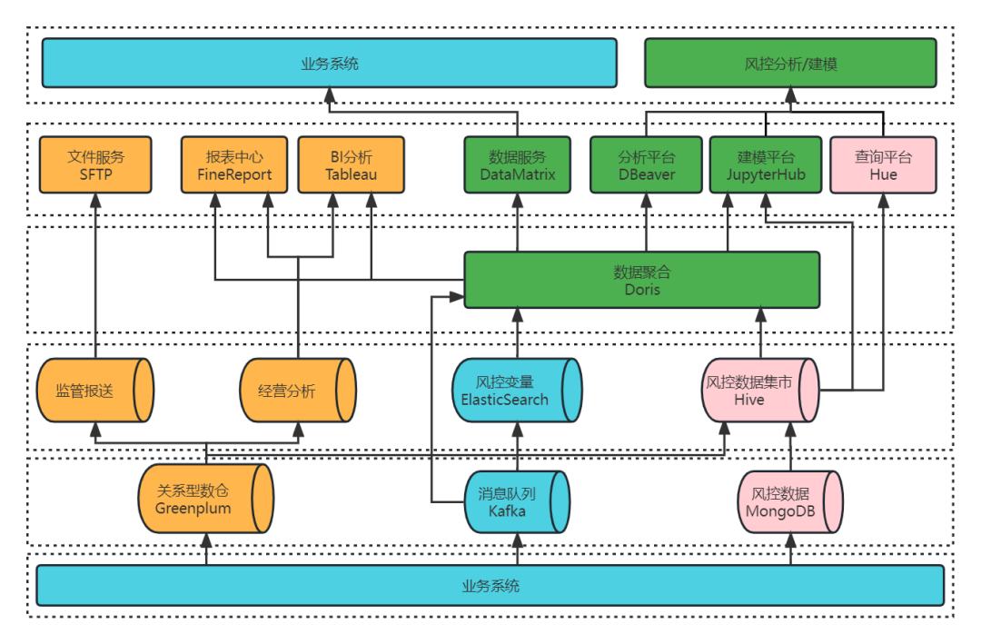 业务系统的核心系统数据通过 CloudCanal 实时同步进入 Greenplum 数仓进行数据实时分析,为 BI 报表,数据大屏等应用提供服务,部分数据进入风控集市 Hive 中,提供查询分析和建模服务。 业务系统的实时数据推送到 Kafka 消息队列,经 Flink 实时消费写入 ES,通过风控变量提供数据服务,而 ES 中的部分数据也可以流入 Hive 中,进行相关分析处理。 业务系统的风控数据会落在 MongoDB,经过离线同步进入风控集市 Hive,Hive 数仓支撑了查询平台和建模平台,提供风控分析和建模服务。