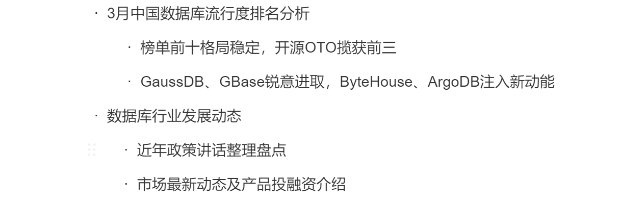 3月《中国数据库行业分析报告》已正式发布(点击即可跳转,欢迎大家下载查阅),本期报盘点了墨天轮“中国数据库流行度排行”、产品投融资等业内资讯以及相关政策讲话,以此呈现当前数据库行业前沿动态与政策引领现状。