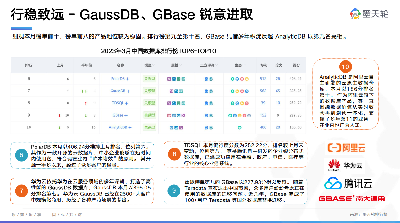 2023年3月的墨天轮中国数据库流行度排行榜共260个数据库参与排名,榜单前十用一句话可以概括为:榜单前八较上月岿然不动,GBase奋勇向前重返第九。在本月排行榜前三中,OTO组合已经连续四月稳健开局,TOP3依次是OceanBase、TiDB和openGauss,且前三甲均为开源数据库,这表明开源给数据库产品带来更多的活力,流行度也随之水涨船高。此外,GBase凭借多年积淀反超AnalyticDB以第九名亮相。