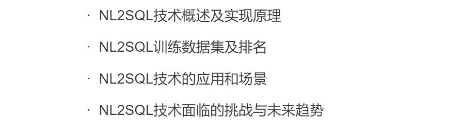 本章节主要整理了NL2SQL技术的实现原理、应用场景及挑战、发展趋势等,并对当前主流的NL2SQL训练数据集进行了介绍,这里为大家摘选了部分内容。首先为大家介绍NL2SQL的定义与简述。NL2SQL(Natural Language to SQL)是语义解析领域的一个子任务,顾名思义是将自然语言转为SQL语句。它可以充当数据库的智能接口,让不熟悉数据库的用户能够快速地找到自己想要的数据,改善用户与数据库的交互方式。