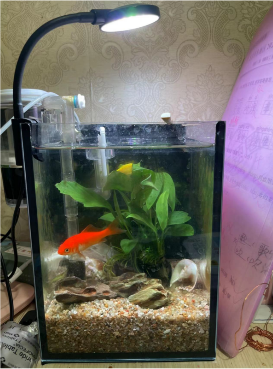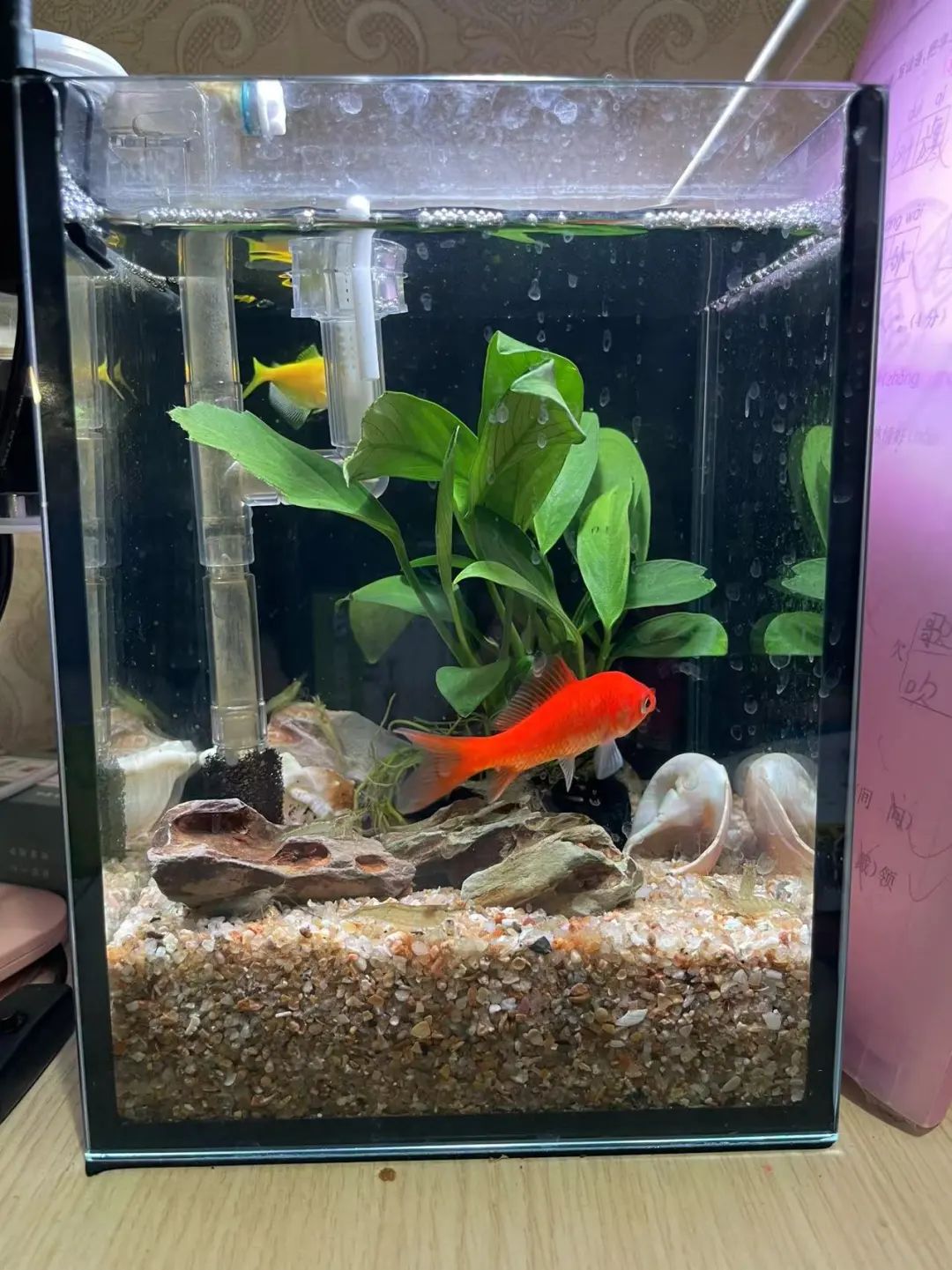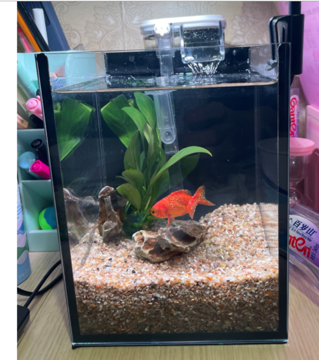 刚买来的鱼缸,就把小金鱼放进去了,以为身上的白色是沙粒