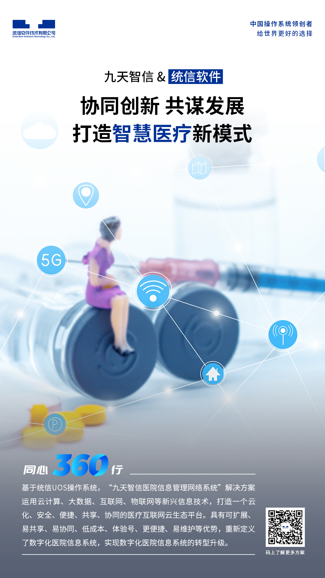 以“让每个人获得更好的健康”为使命,九天智信将继续携手统信软件,以数字化形式提供医疗卫生行业数据收集、存储、传递、处理的业务和技术平台,推动以数字化形式提供医疗卫生行业数据收集、存储、传递、处理的业务和技术平台,助力医疗行业打造医疗卫生信息资源的集中统管、统一调配、按需服务,为医疗行业数字化、智能化转型提供核心支撑。