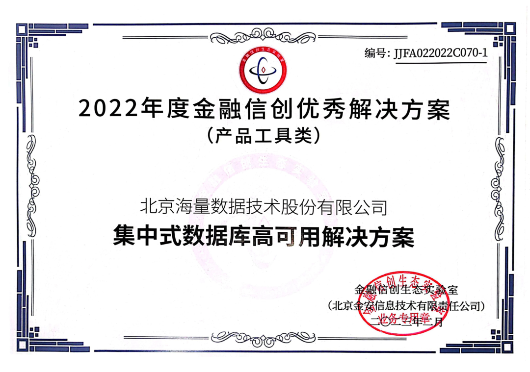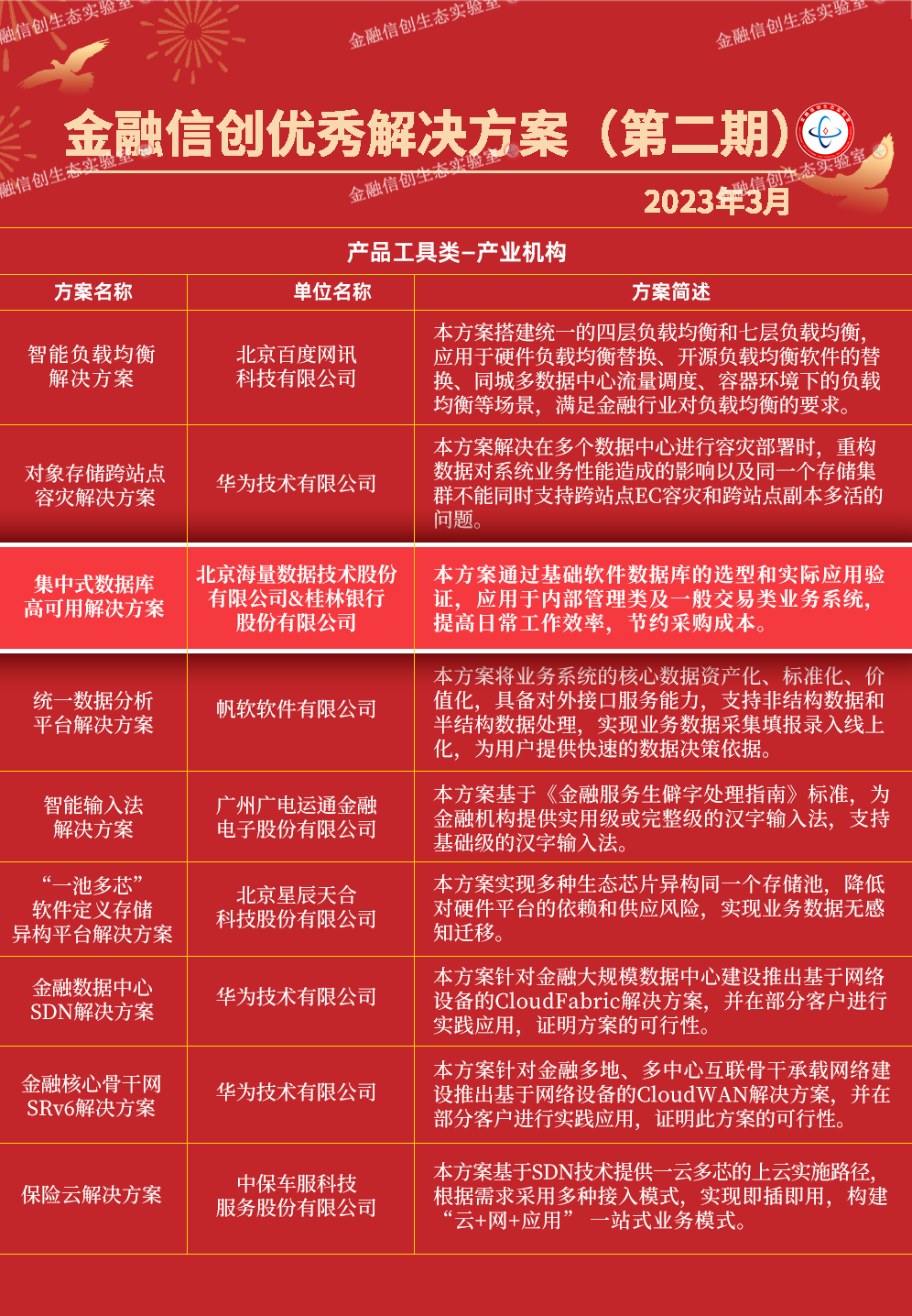 如今,这一强强合作中的集中式数据库高可用解决方案得到了信创行业内的高度认可。近日,由中国金融电子化集团有限公司、金融信创生态实验室主办的“金融信创解决方案研讨大会”在北京召开,会上发布了第二期金融信创优秀解决方案的名单,该方案凭借在实践中的出色表现成功入选。