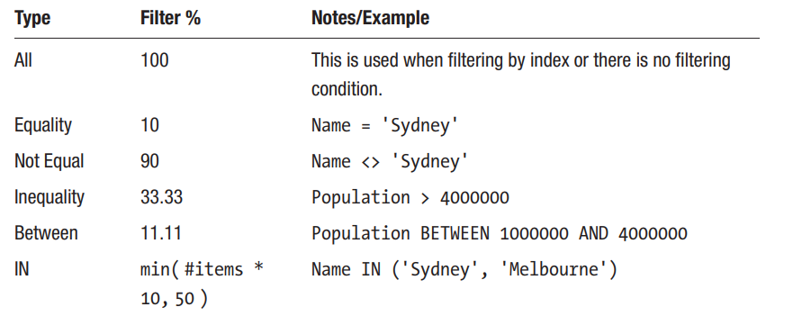 当使用索引时,当过滤器与其他表不相关时,优化器可以非常准确地估计与索引匹配的行数。如果没有索引,直方图统计可用于获得良好的滤波估计。当没有过滤列的统计信息时,就会出现困难。在这种情况下,优化器会后退基于内置默认估计。