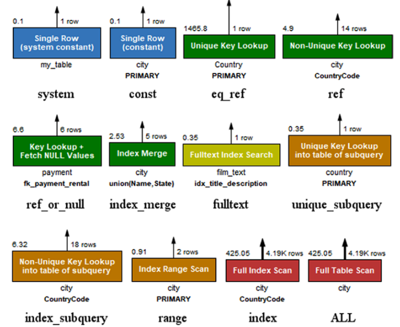 优化器可以选择两种方式来获取匹配的行。一种方法是使用CountryCode上的索引查找索引中的匹配行,然后查找请求的行值。另一种方法是进行全表扫描并检查每一行确定它是否符合where条件。
