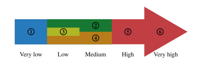 Blue (1) is the cheapest; green (2), yellow (3), and orange (4) represent low to medium costs; and the most expensive access types and operations are red symbolizing a high (5) to very high (6) cost.