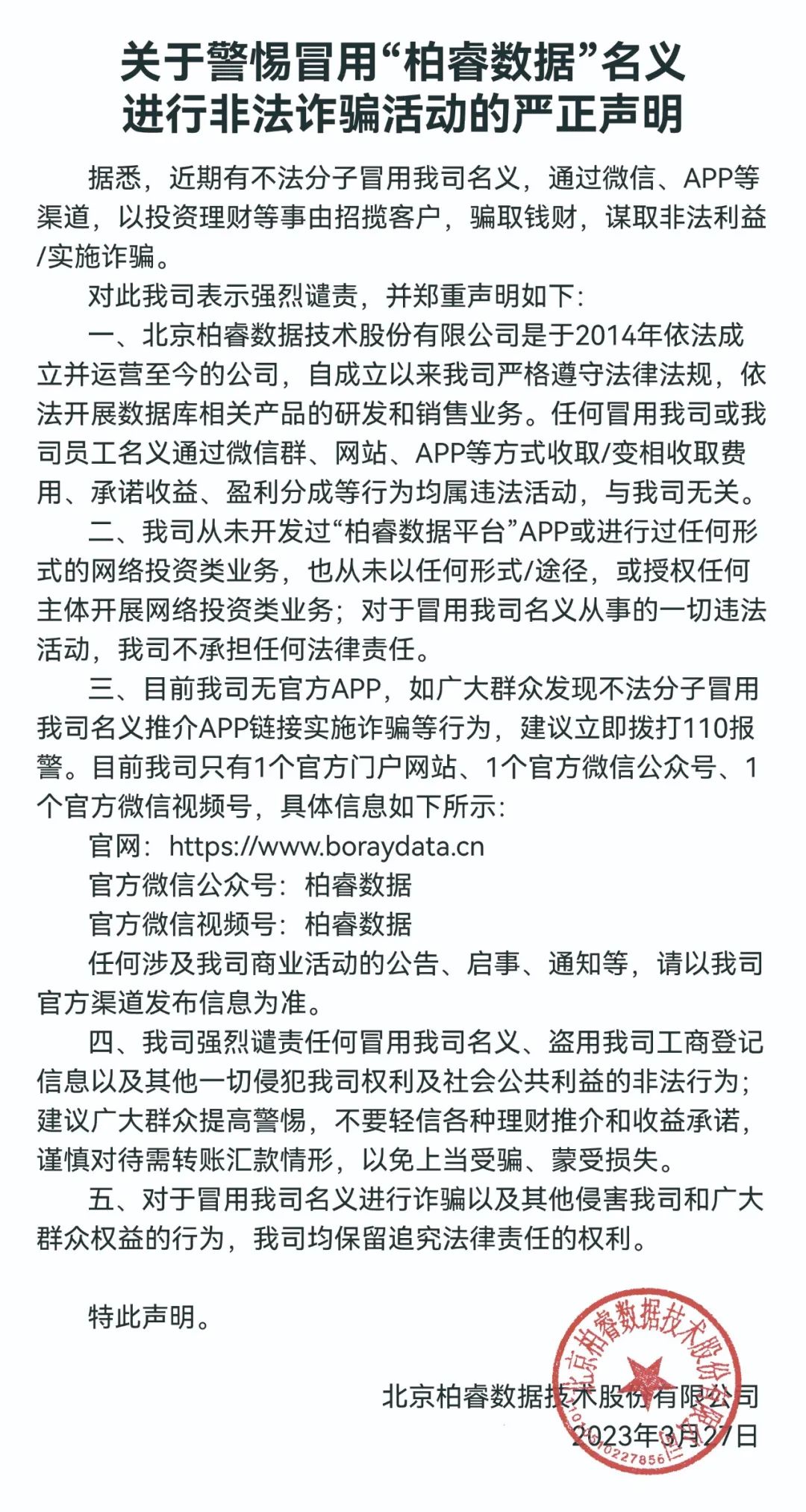 关于警惕冒用“柏睿数据”名义进行非法诈骗活动的严正声明