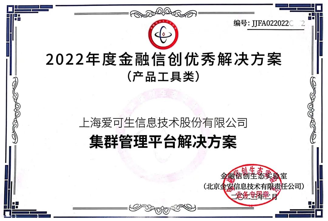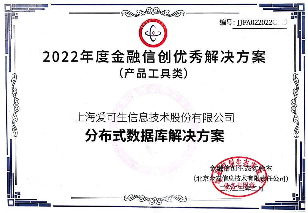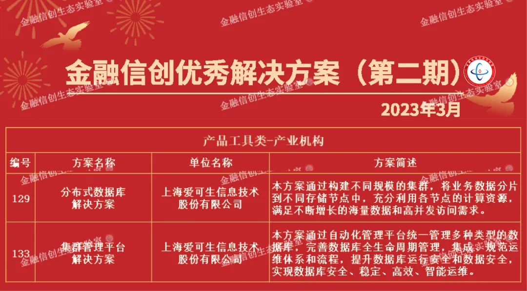 2023年3月21日-22日,中国金融电子化集团有限公司金融信创生态实验室在京举办金融信创解决方案研讨会,正式发布第二期金融信创优秀解决方案,作为信创产业建设前行者,爱可生凭借自主研发的“分布式数据库解决方案”、“集群管理平台解决方案”两项解决方案成功入选该名单,获得金融信创权威部门的高度认可。