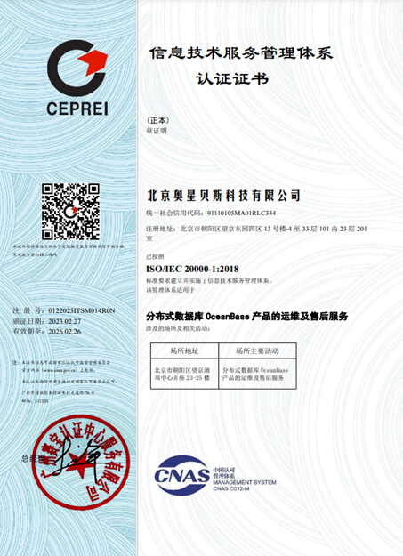 近日,北京奥星贝斯科技有限公司(OceanBase 数据库)在获得 ISO9001、ISO14001、ISO45001 及 ISO27001 等认证后,又于技术服务方面通过了 ISO20000 认证和 ITSS 认证。 OceanBase 可以提供完善的服务体系,包括交付服务、运维服务、测试服务、迁移服务、架构咨询服务、客户成功服务以及培训认证服务等,为客户提供超 7 大类 31小类的全方位覆盖、全生命周期保障的专家服务。同时提供覆盖全球 7*24 小时及时响应的远程技术支持服务,遍布全国的分级快速到场服务和包含三方开放生态伙伴在内的全面交付运维等服务。