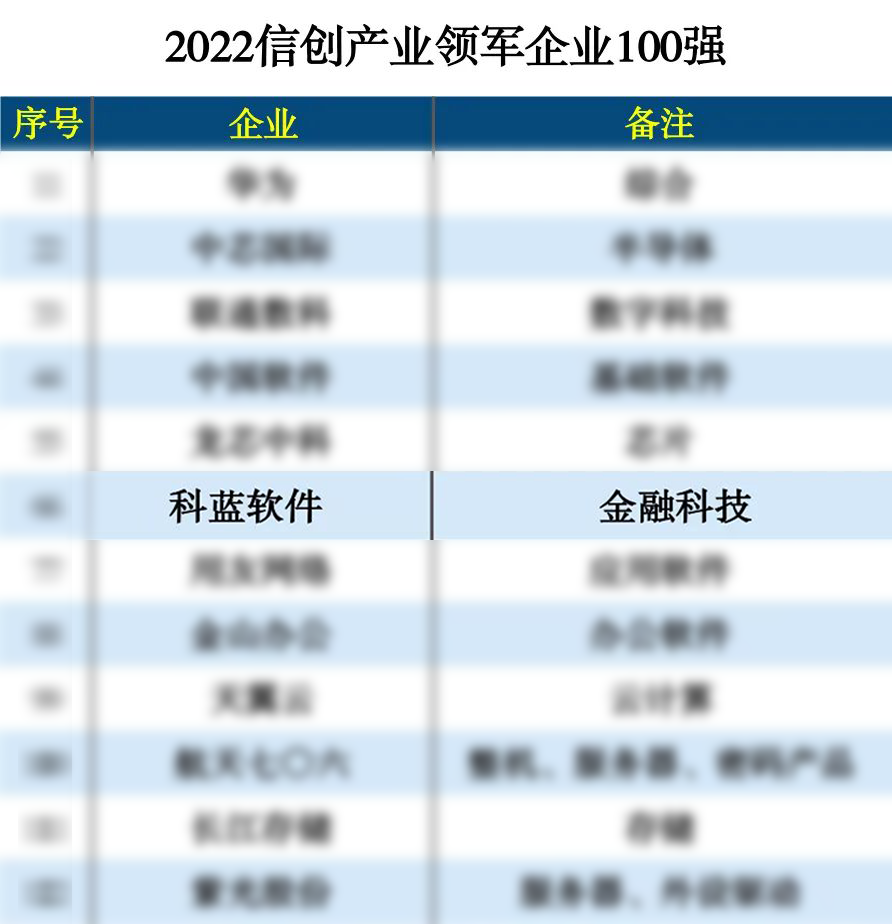 2022年12月22日,互联网周刊发布了“2022信创产业领军企业100强榜单”。信创企业即信息技术应用创新产业相关企业,涵盖了数据库、半导体、芯片、数字技术、工业软件、信息安全、金融科技等多个细分领域。其中华为、中芯国际、科蓝软件等知名本土企业入选名单。