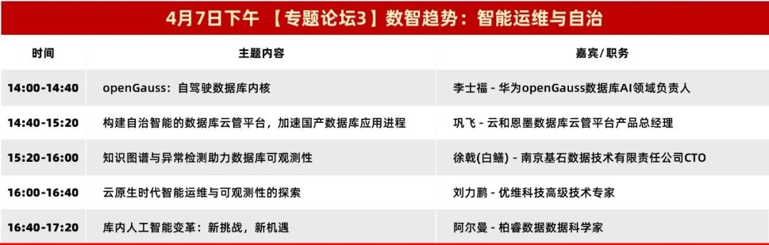 近几年人工智能技术已逐渐发展成熟,并逐步渗入到各行各业,智能能力被越来越多地应用到数据库内核和运维管理产品中,从而为用户提供更加稳定、高效、智能的数据库环境。openGauss、云和恩墨、南京基石数据、优维科技、柏睿数据将就如何构建数据库自治能力和数据库运维产品的智能能力在“数智趋势:智能运维与自治”专题发表演讲。