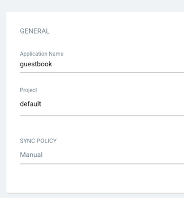2、将应用命名为‘guestbook’并且使用默认项目。此时可以将同步策略设置为‘手动’。