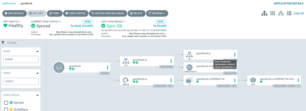 搞定应用创建后,可通过在 CLI 输入‘argocd app get guestbook’查看状态,或通过 Web 管理选项卡界面查看: