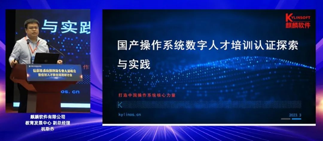 麒麟软件作为标准起草组主要成员单位受邀出席,并发表主题演讲,分享麒麟软件在国产操作系统数字人才培训认证方面的探索与实践。