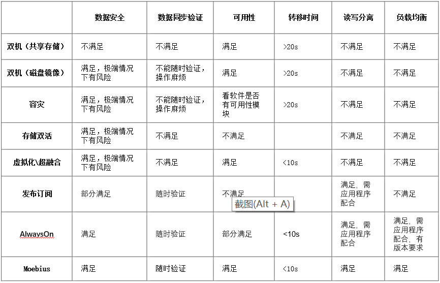 数据同步验证:每个节点上的SQL Server服务都是开启的,数据都是可供使用的,可以随时执行SQL语句进行验证。可用性:支持数据库和实例级对象(登录账号、作业、链接服务器、系统库对象等)的同步,满足真正的高可用。故障转移时间:节点转移时不需要经过数据库初始化的过程,切换速度快,少于10秒。读写分离:每个节点上的SQL Server服务都是开启的,数据都是可供使用的。Moebius的调度引擎支持语句级的解析,只需要修改应用程序的数据库连接串让应用程序连接到Moebius集群的端口,在Moebius中配置基于语句特征的相关规则就可以在不修改或者少修改应用程序的前提下实现读写分离。Moebius支持SQL语句、登录名、客户端主机名、应用程序名等多个维度进行规则的配置。负载均衡:Moebius是基于节点压力状况的动态负载均衡策略,调度引擎定期缓存每个节点的负载情况(CPU利用率、IO性能指标、请求数等),应用程序执行查询语句时,调度引擎选择到压力较小的节点执行。从根本上说是通用技术和SQL Server专用技术的比较,如果要实现数据安全和可用性等基本需求,通用技术就能可以做到,如果要实现读写分离、负载均衡等高级别的需求,就需要充分利用SQL Server特性而开发的专用技术。并不是说通用技术不好,只是满足的场景不同而已,我们要根据实际的场景选择合适的方案。